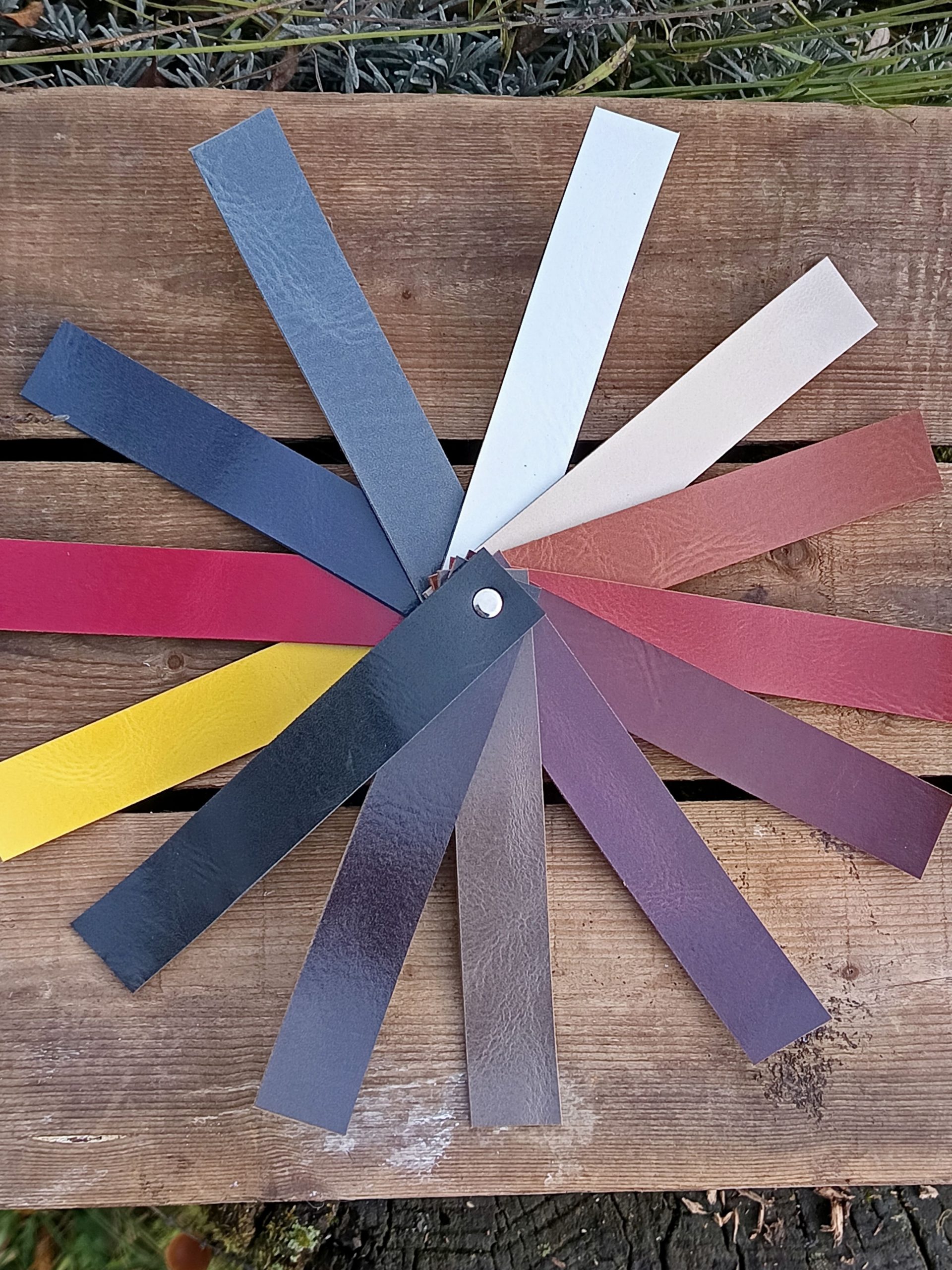 Diese weich–mittelfesten Riemen aus hochwertigem Rindsspaltleder sind mit einer ultrafeinen Glanzfolie beschichtet. Die Folie trägt eine dezente Struktur und Maserung, die im Licht leicht schimmert – für einen edlen, modernen Look.